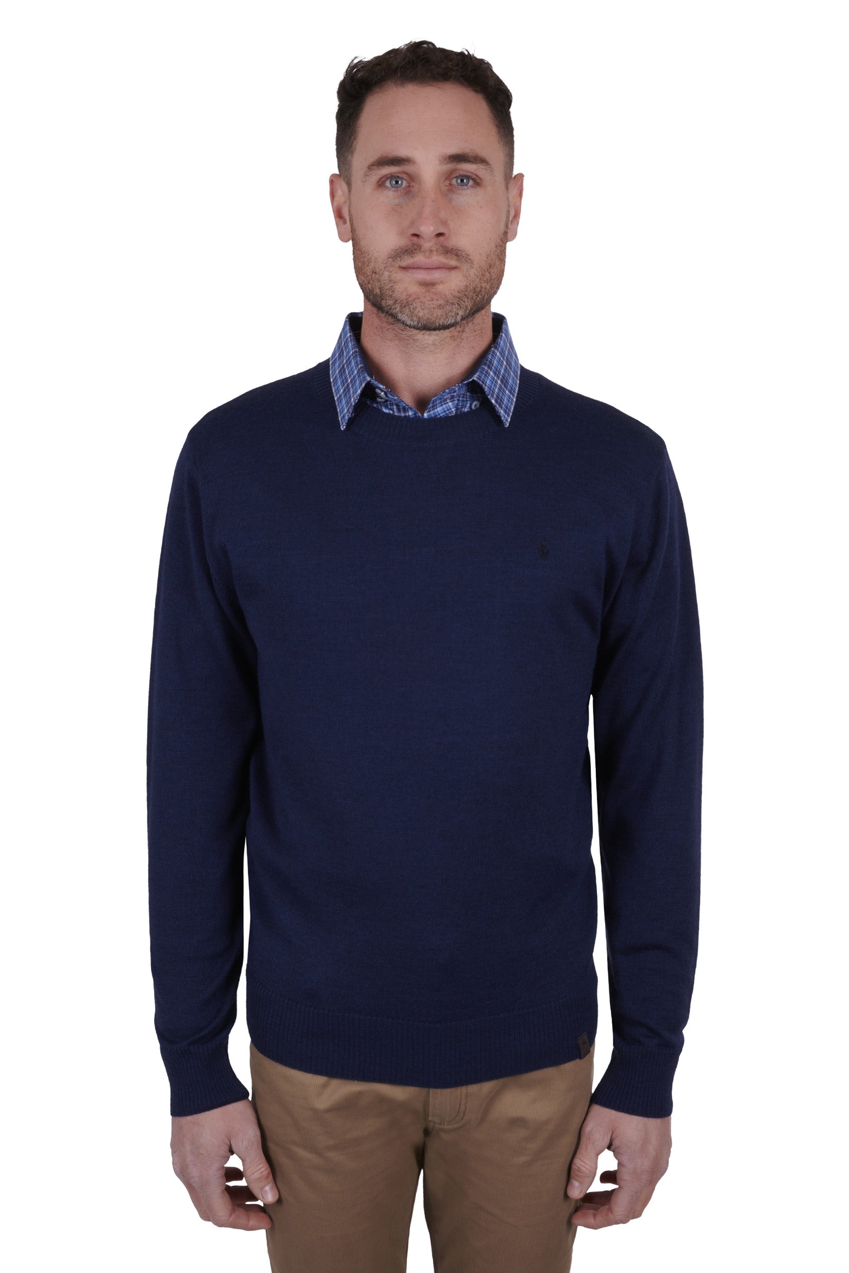 Lightweight crew neck knit, Australian merino wool blend, transeasonal for all year round, rib detail at neck, sleeve cuff and hem to keep shape, contrast chambray back neck facing, horseman embroidery on chest
