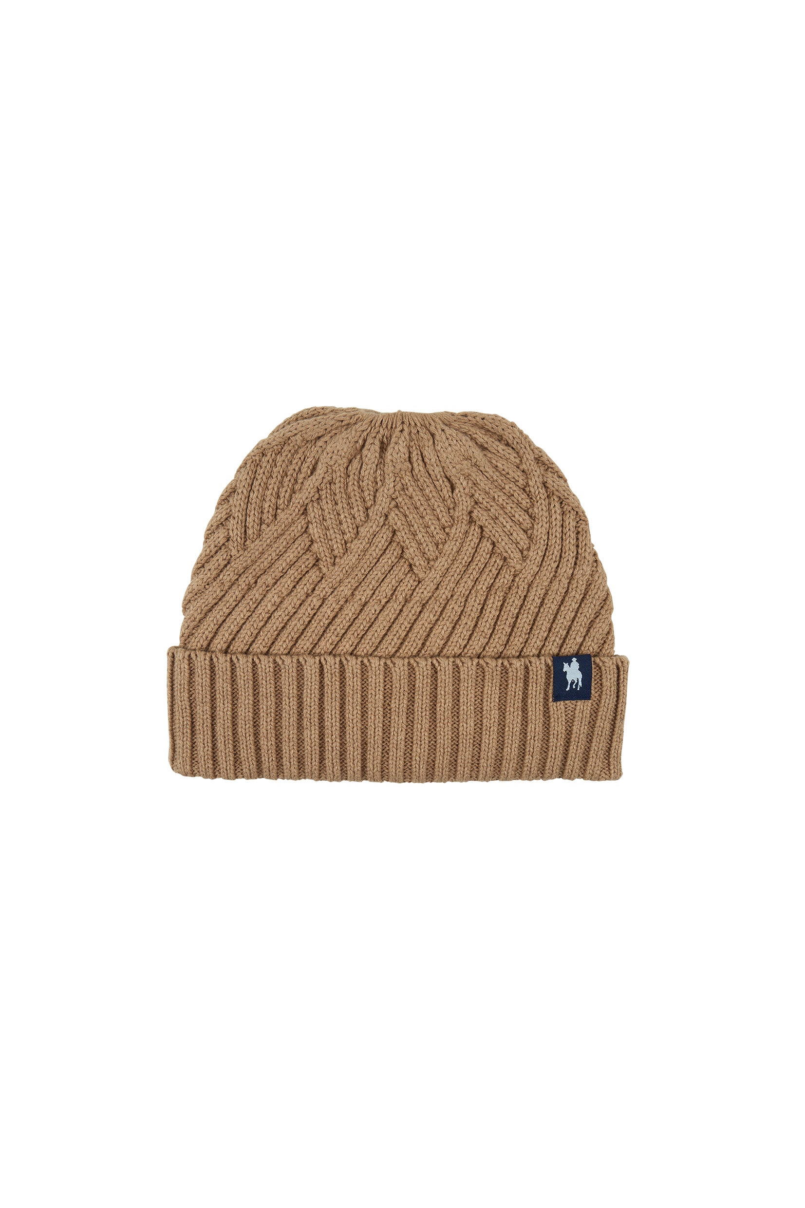 Top opening for ponytail, polar fleece lining, wool blend for warmth.