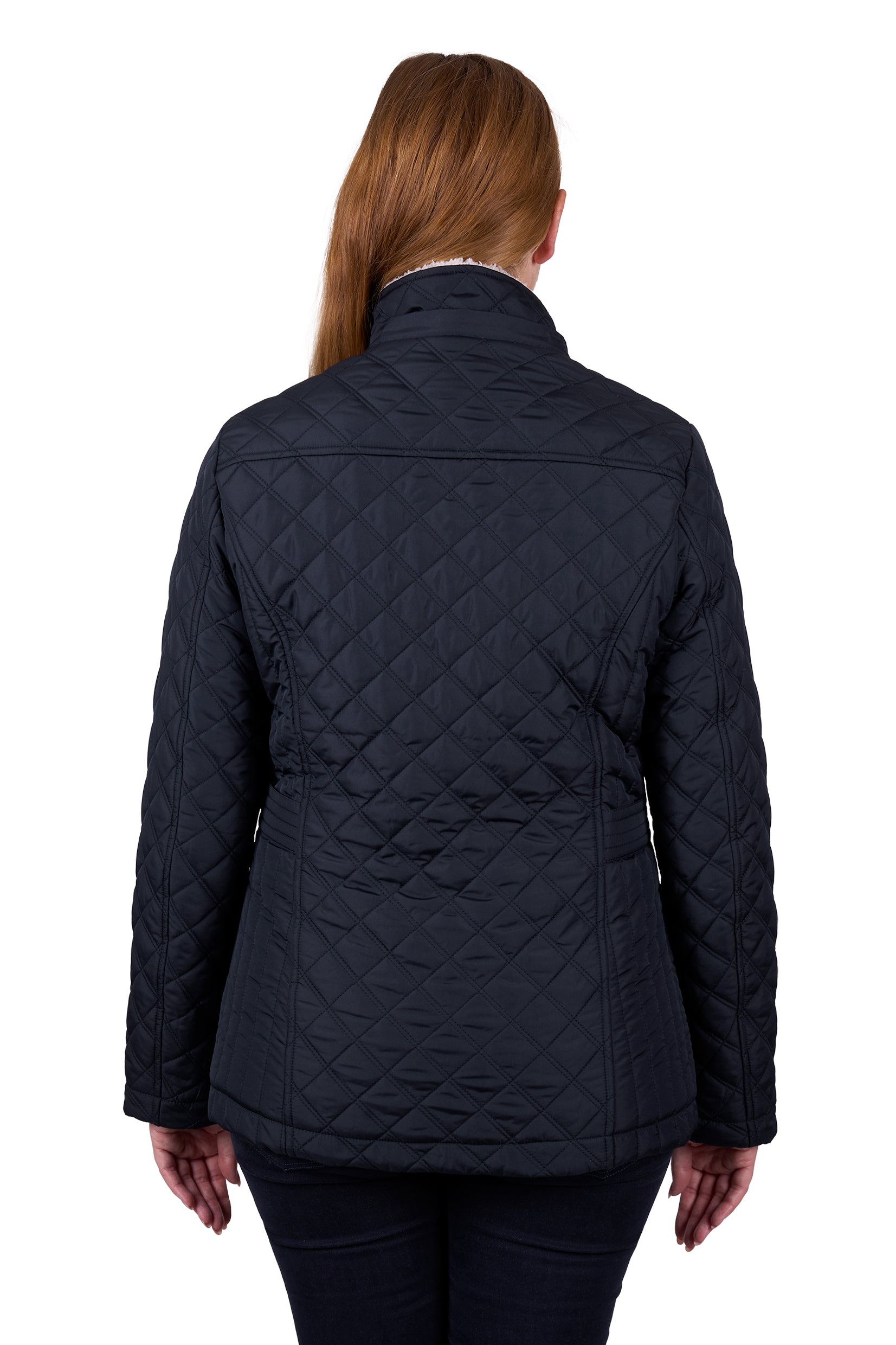 Lightweight diamond quilted body and sleeves, quilted waist shaping to flatter the figure, mock waist tab, rust proof metal accessories, premium quality zip closures, detachable hood, sherpa body and hood lining, front side pockets with snap closure